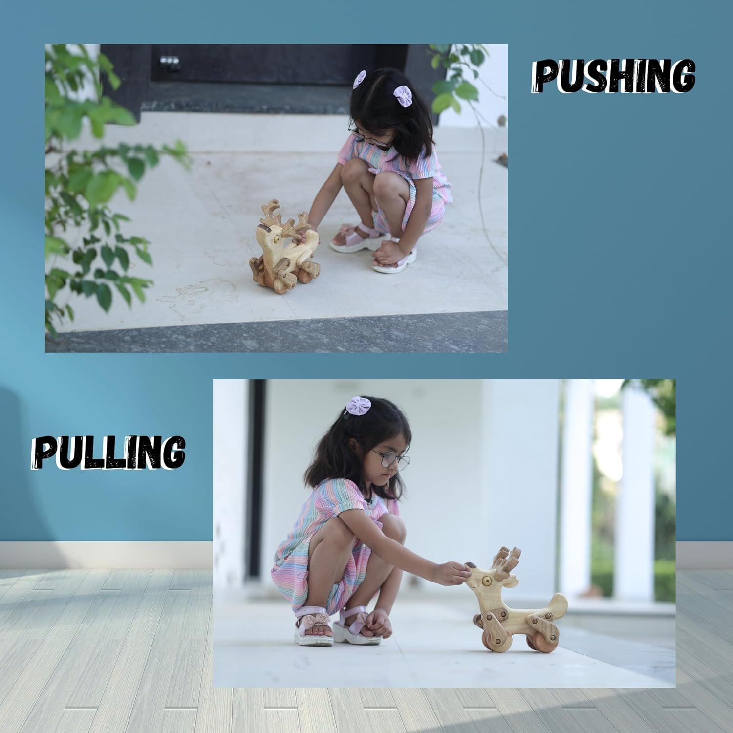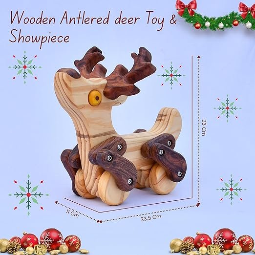 Handcrafted Wooden Christmas Reindeer Toy Push and Pull Toy, Moving Parts with Wheels, Natural Wood Finish, Decorative Showpiece